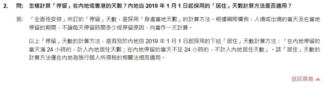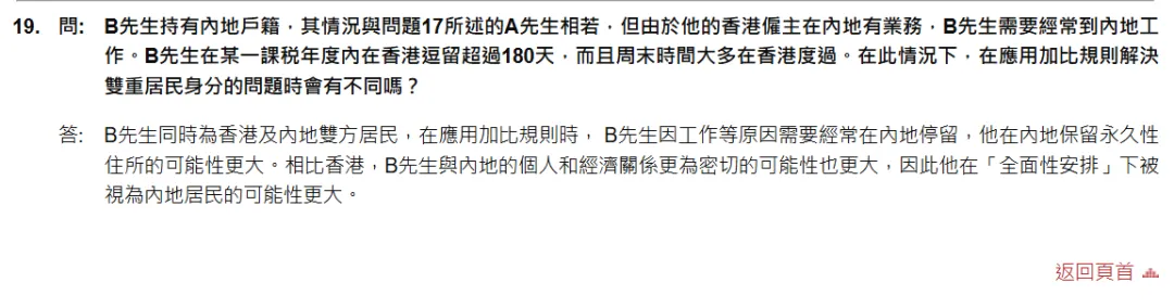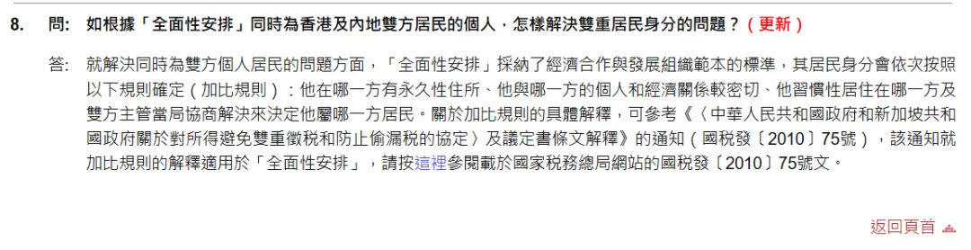 为解决“双重税务居民身份”争议,两地税收安排引入了国际通用的“加比规则”来决定最终归属。