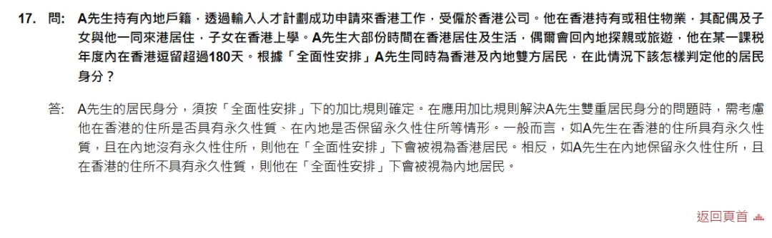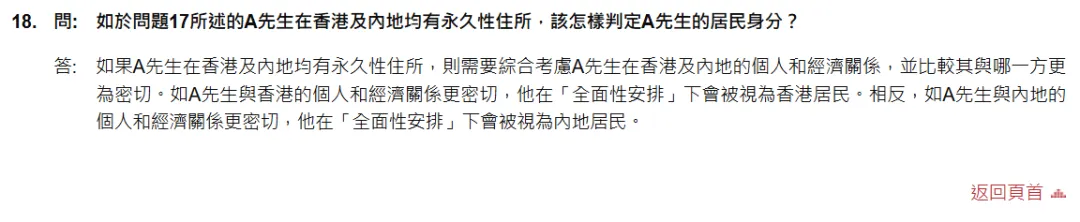 若A先生同时在香港及内地均有永久性住所,那么接下来就需要考虑他在香港及内地的个人和经济关系,并比较其与哪一方更为密切,以此来判断归属。