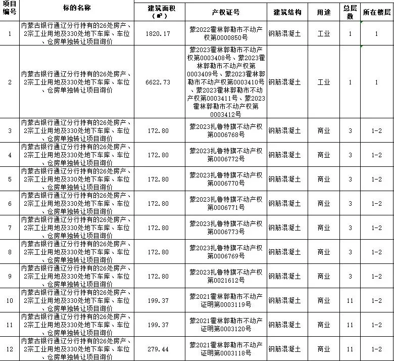 项目名称:内蒙古银行通辽分行持有的26处房产、2宗工业用地 及330处地下车库、车位、仓房单独转让项目询价
