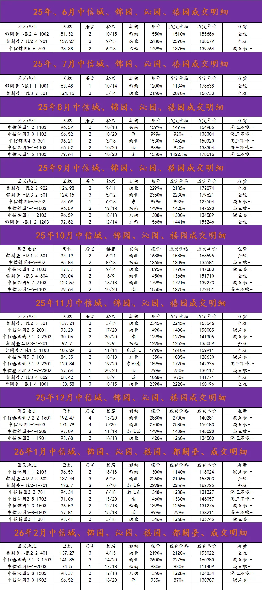 截止26年2.24中信城近半年1-4期二手房成交数据参考