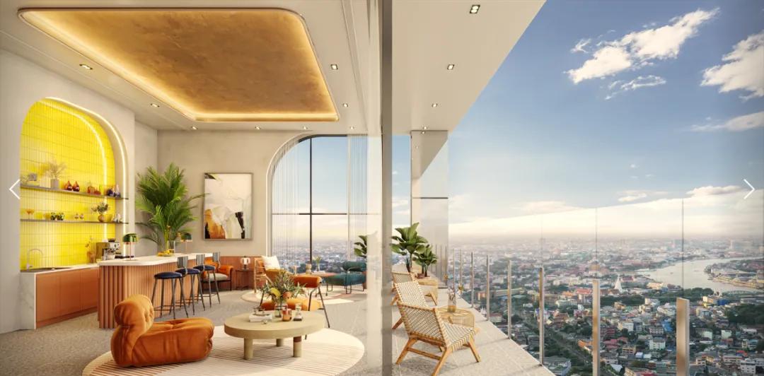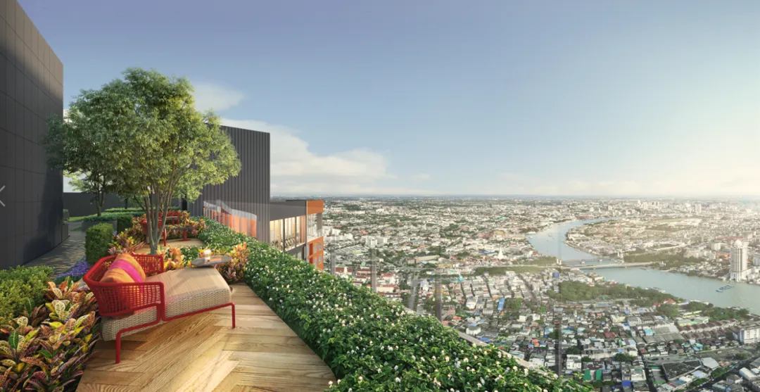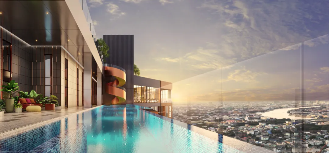高性价比的河景生活:项目距湄南河仅10分钟步行,15层以上即可享受河景,公共设施部分位于顶层,提供全景视野。