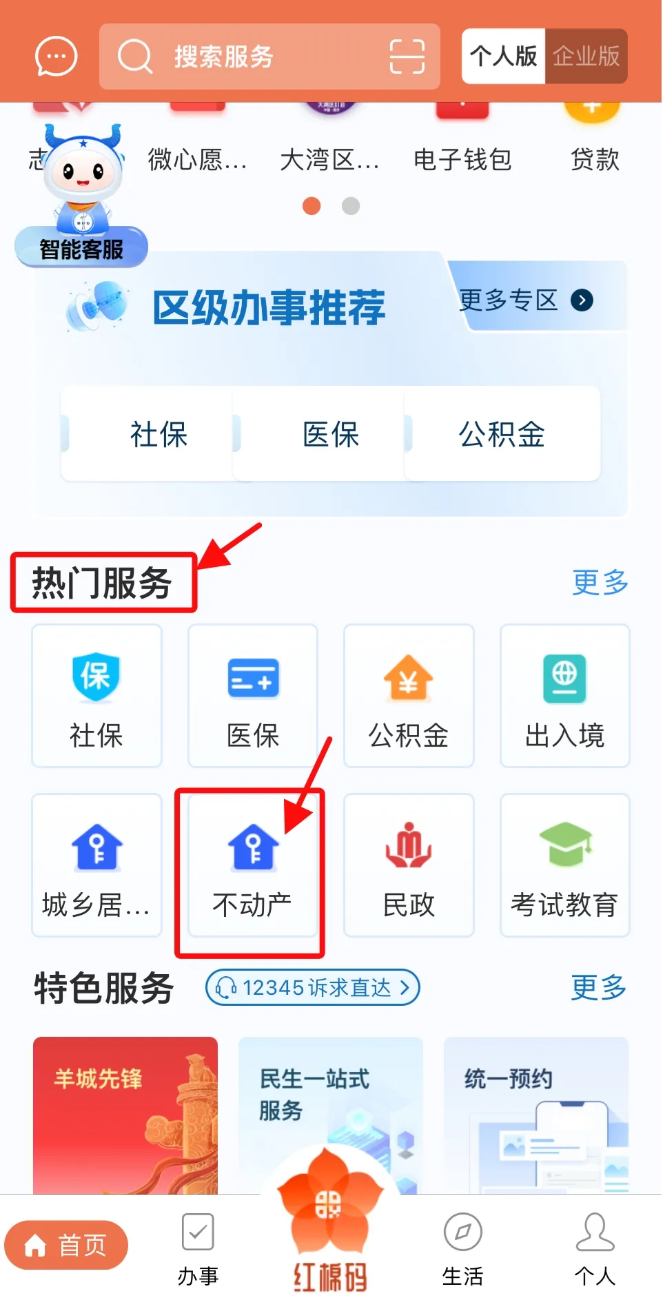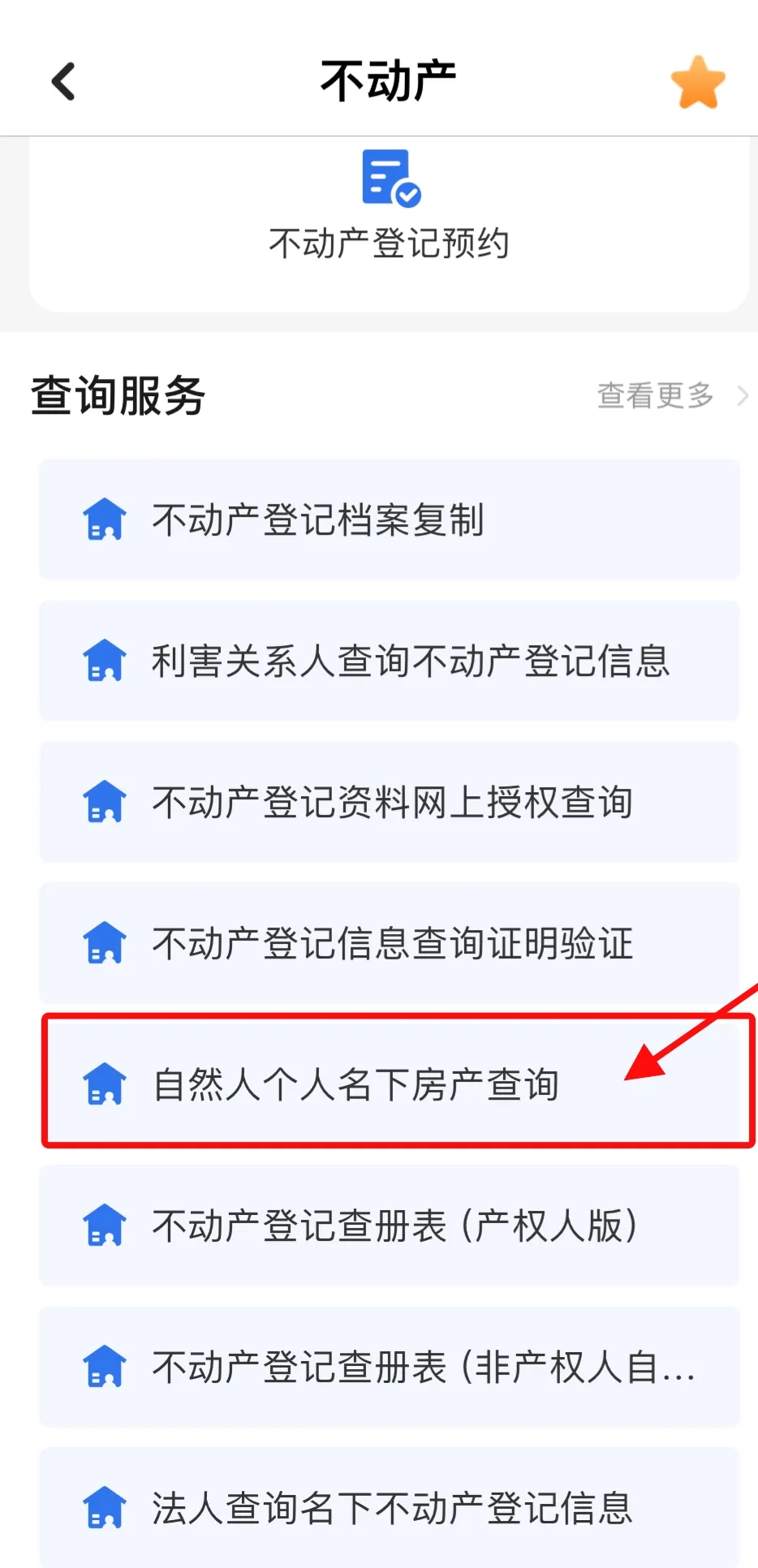 在“穗好办”首页点击“热门服务”中的“不动产”,进入广州市不动产登记资料查询服务列表,选择“自然人个人名下房产查询”,并点击进入。