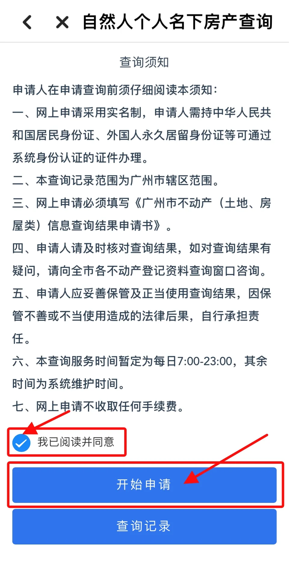 阅读“查询须知”,并勾选“我已阅读并同意”后点击“开始申请”,查询前需微警人脸认证。