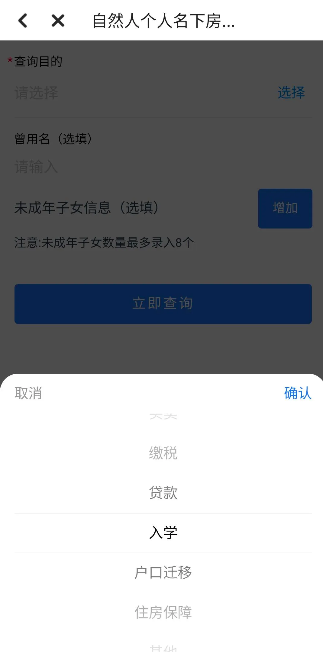 通过验证后,选择查询目的,并可以选择输入自己的曾用名和未成年子女信息,之后点击“立即查询”。
