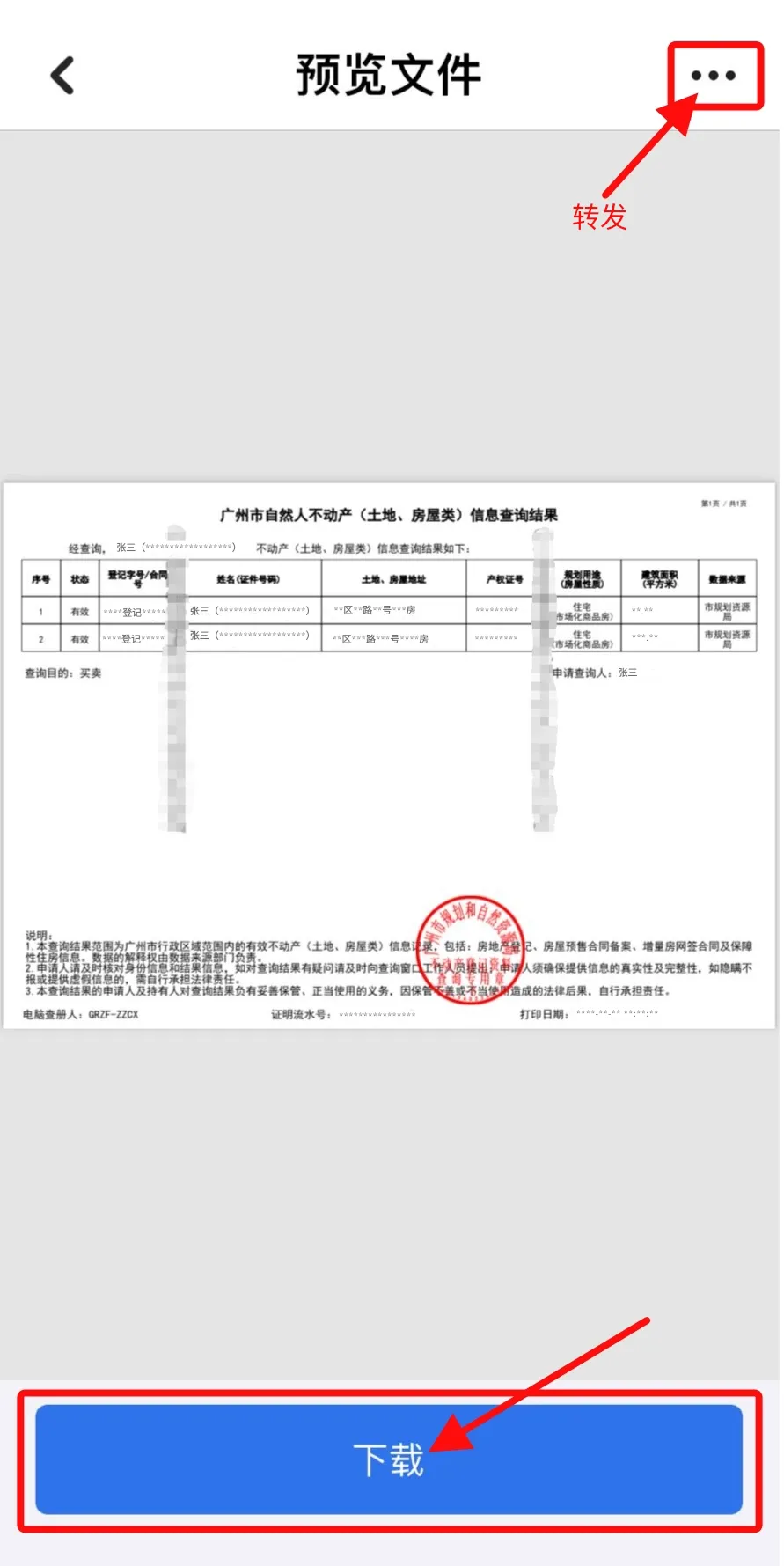 在查询结果预览页面,可点击下方的“下载”按钮保存查询结果文件,也可点击右上方的“…”或“分享”转发查询结果文件。