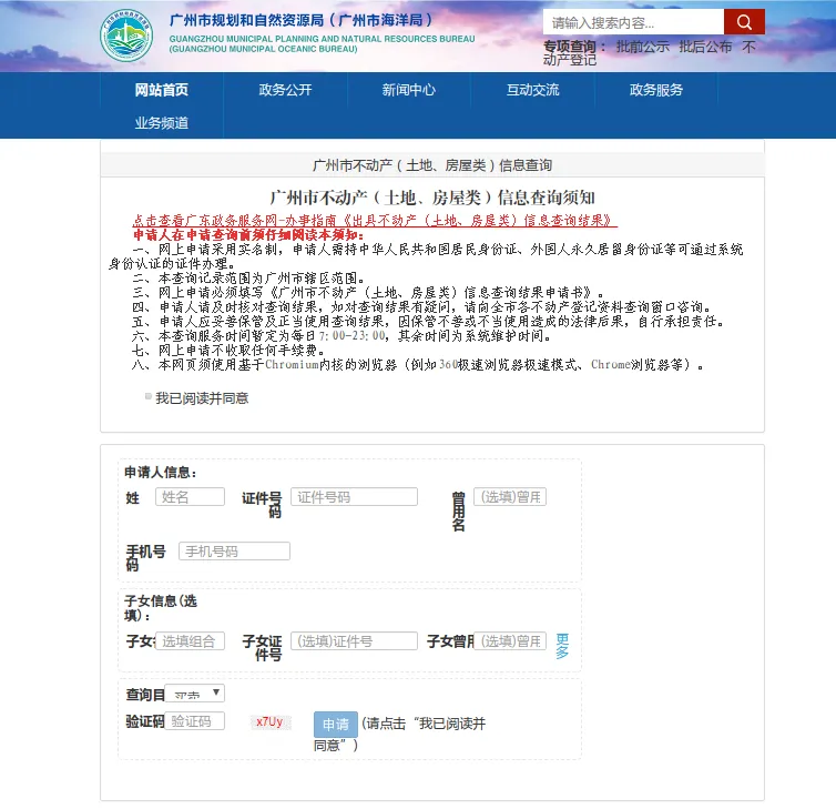 阅读查询须知,并勾选“我已阅读并同意”,输入申请人姓名和身份证号码以及手机号码,并可以选填申请人曾用名和未成年子女信息,之后再选择查询目的及填写验证码,点击“申请”。
