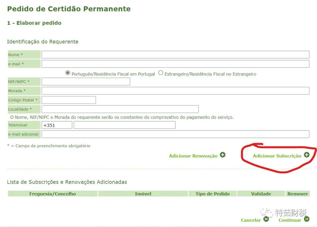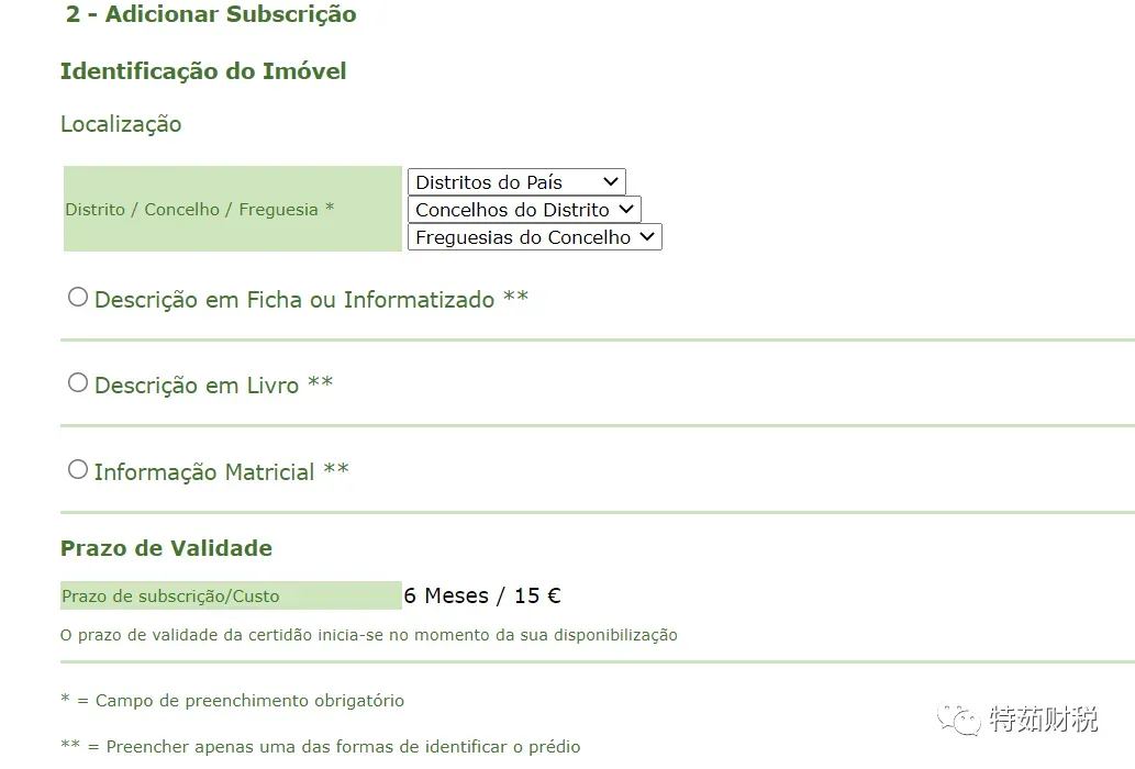 填写完毕后,选择 “Adicionar Subscrição”,进入如下界面,需要您继续验证并填写房产相关的信息。上述信息可以从您之前的房产文件上查询到。