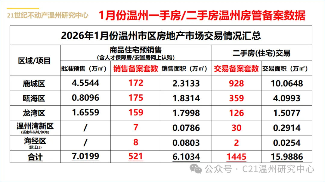 近日,据C21温州研究中心发布2026年1月市区房地产交易数据,一手住宅销售备案521套、二手住宅成交备案1445套。对比2025年、2024年同期数据,温州楼市呈现出新房、二手房成交三连降、市场结构性分化加剧的鲜明特征。