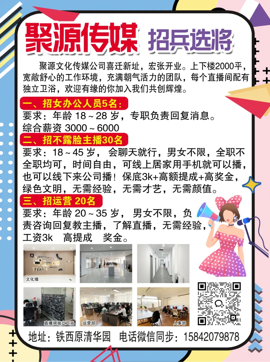 聚源文化传媒公司喜迁新址,宏张开业。上下楼 2000 平,宽敞舒心的工作环境,充满朝气活力的团队,每个直播间配有独立卫浴,欢迎有缘的你加入我们共创辉煌。