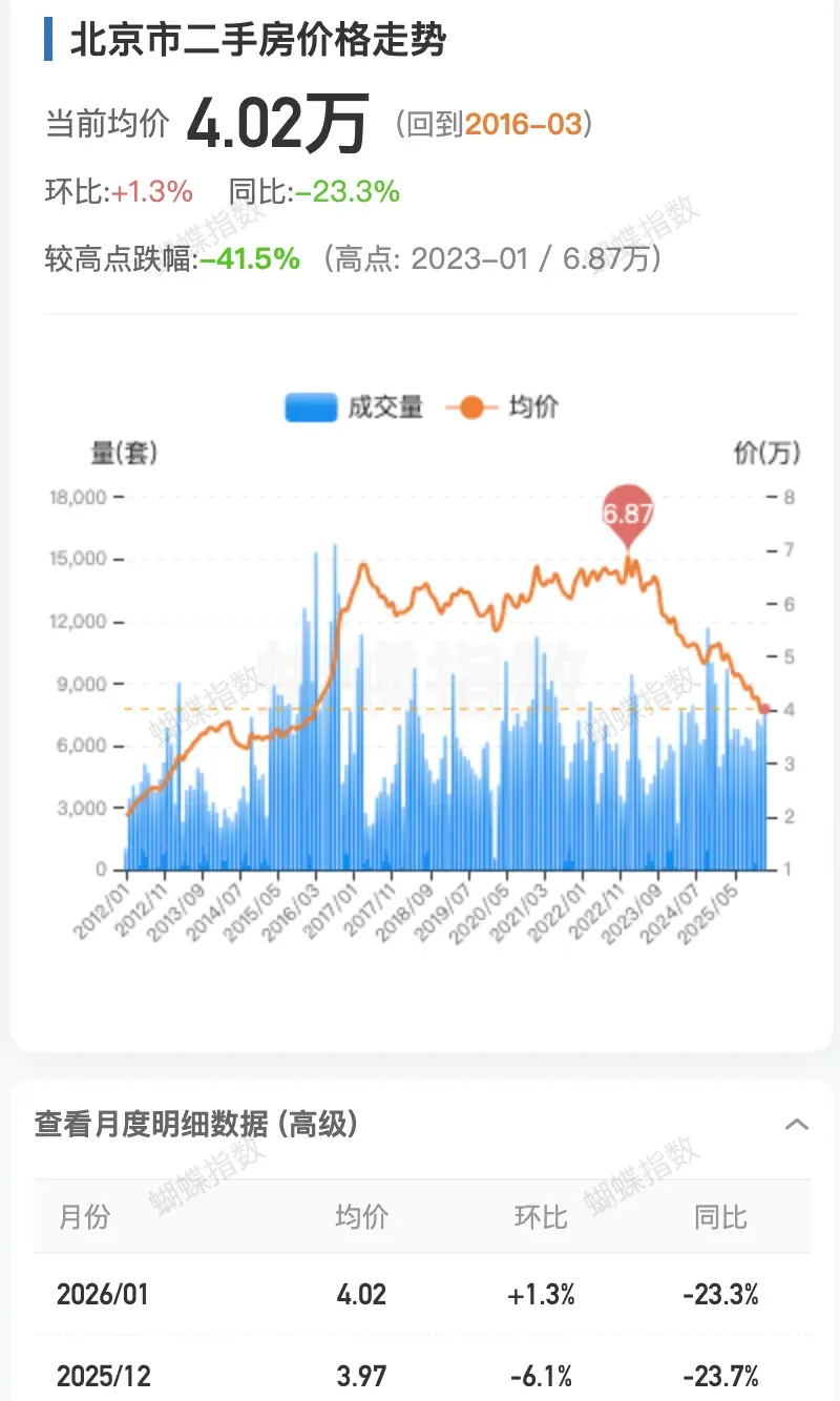 2026年1月份,北京二手房成交均价重新回到了4万+,而去年12月份北京统计的二手房均价还在3.6万元左右,不到一个月时间,二手房价环比上涨1.5%。