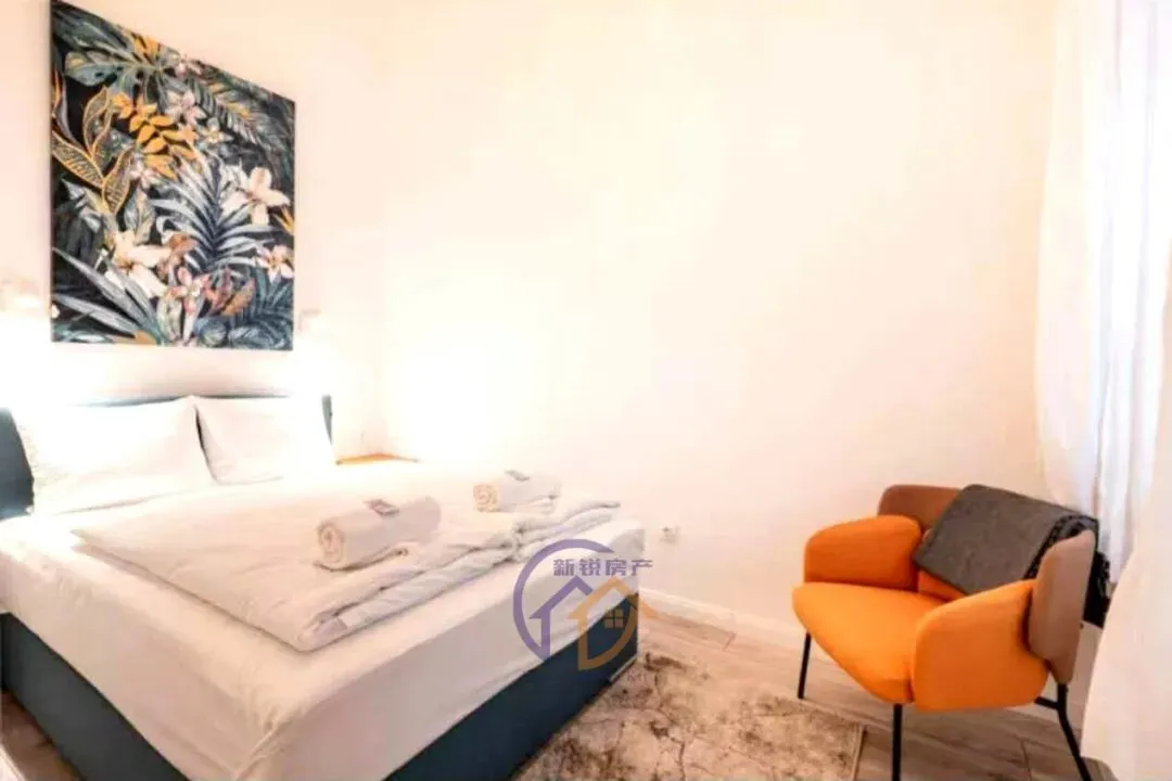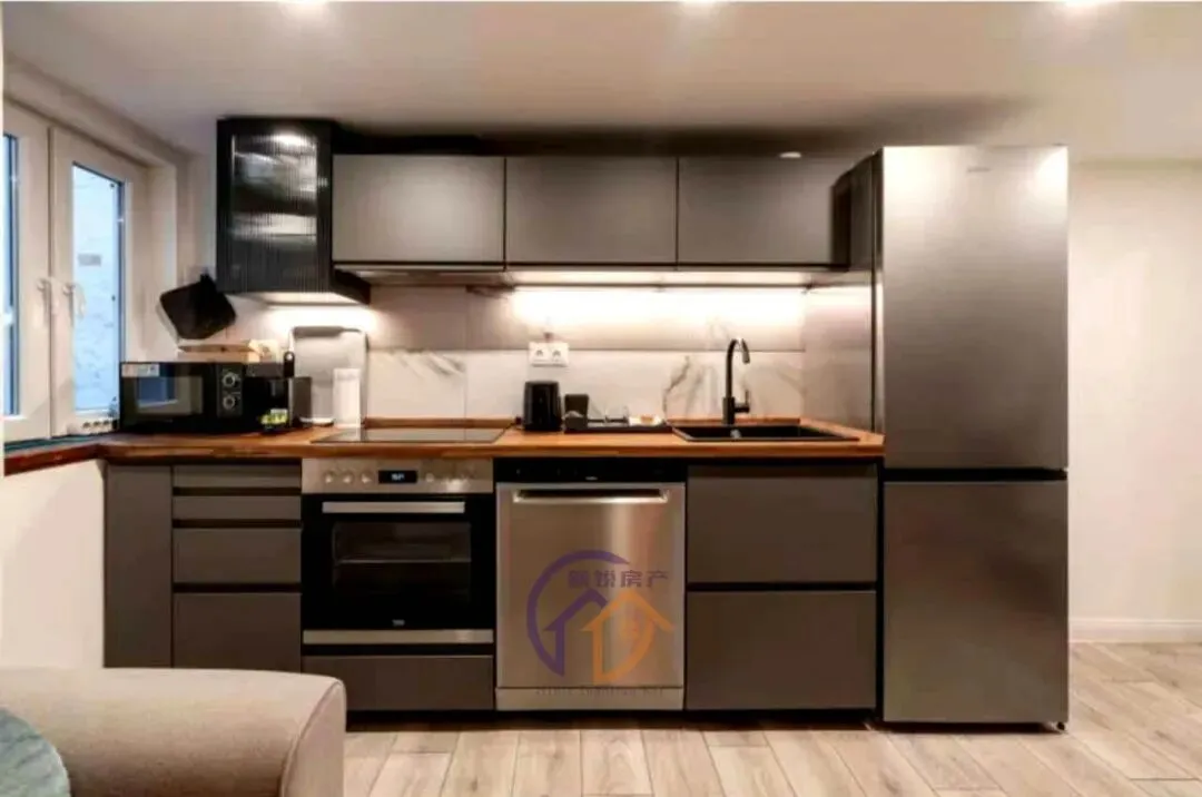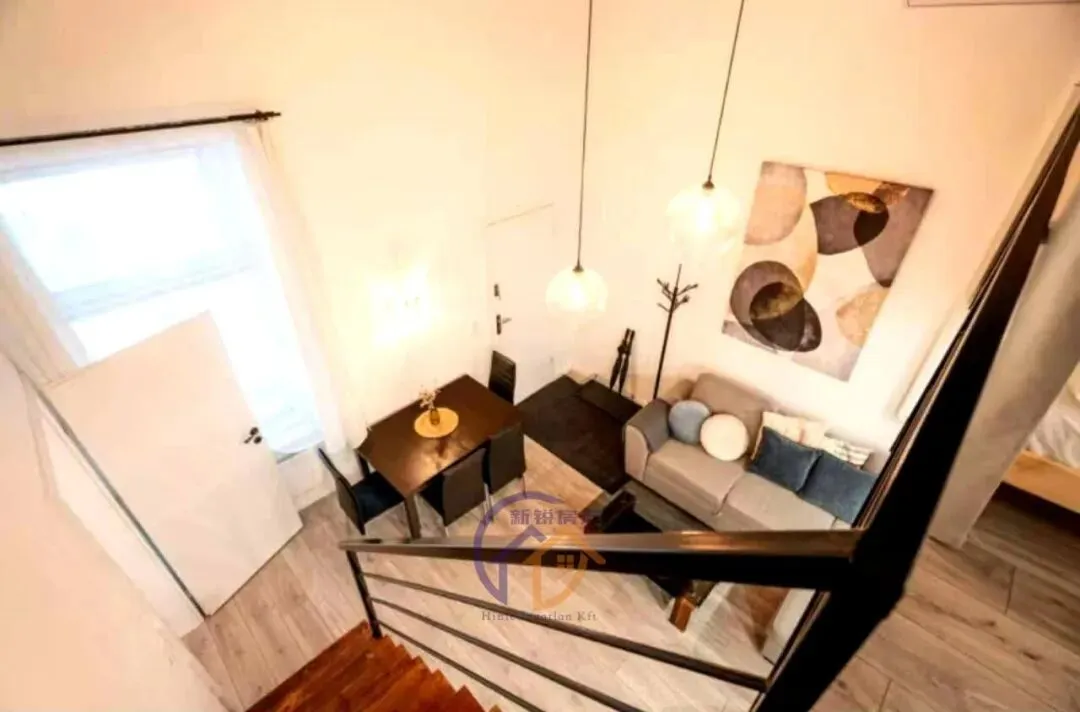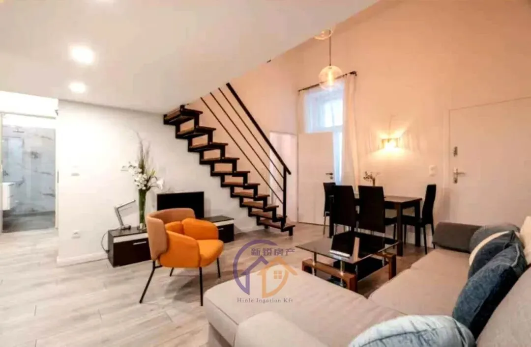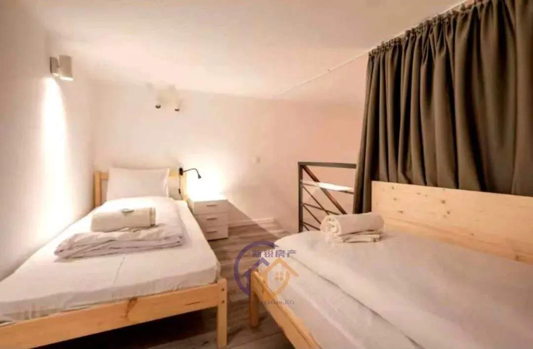 右边套:大约50平米。 一室一厅+客厅带阁楼,厨房,浴室,阁楼上面可放书桌,也可放床睡人可做两室用,内高4米,阁楼可站立,全新精装修,家具家电齐全,拎包入住。