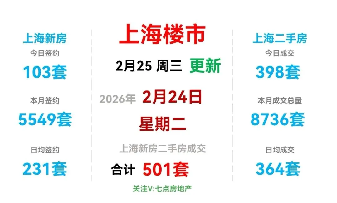 昨日(2月24日,周二),上海新房和上海二手房成交量合计501套。