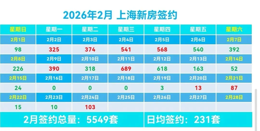 🏠2月上海新房总签约5549套,日均签约231套,本月签约总面积45.22万m²,套均面积91.45m²。