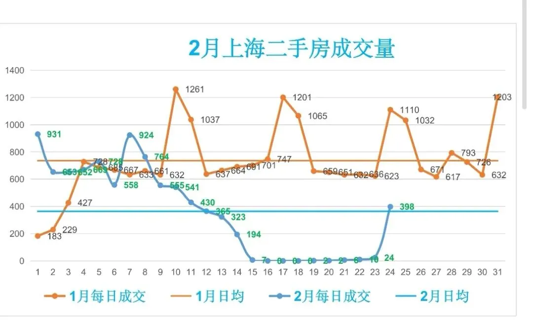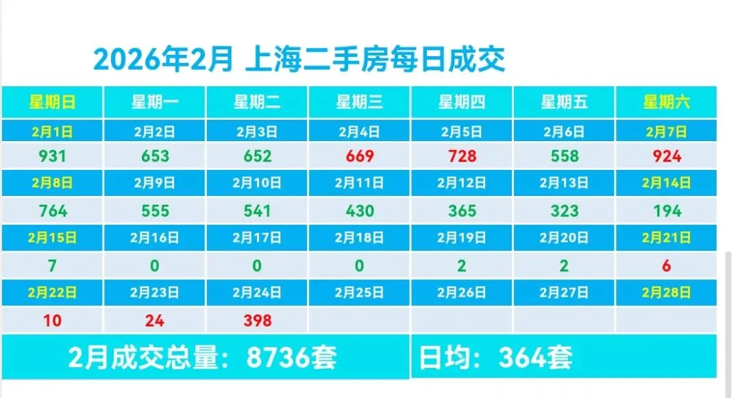 🏡2月,上海二手房成交量累计8736套,日均成交364套,较上个月日均减少372套(降幅50.54%)。