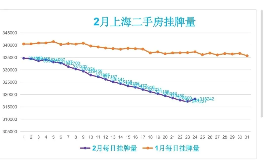 🏠昨日(2月24日,周二)挂牌318242笔,较前一日增加1015笔,日均挂牌326071笔,约32.61万笔,挂牌与实际成交比895:1,去化周期约29.9个月。