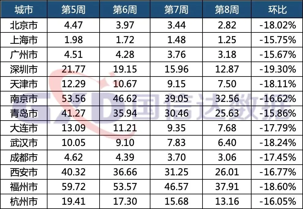 北上广深四个一线城市,北京市挂牌量指数环比下降18.02%,上海市挂牌量指数环比下降15.75%,广州市挂牌量指数环比下降15.67%,深圳市挂牌量指数环比下降19.3%。