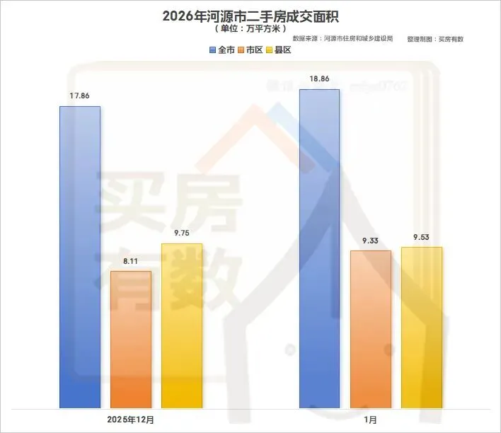 2026年1月份,河源市全市二手房成交面积18.86万平方米,环比上升5.6%,其中市区成交面积9.33万平方米,环比上升15.04%;县区成交面积约9.53万平方米,环比下降2.26%。