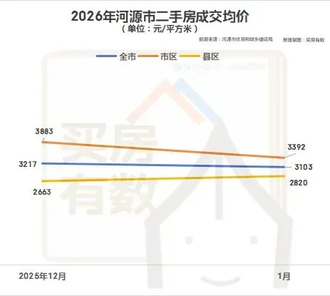 2026年1月份,河源市全市二手房成交均价约3103元/平方米,环比下降3.54%,其中市区成交均价约3392元/平方米,环比下降12.65%;县区成交均价约2820元/平方米,环比上升5.91%。