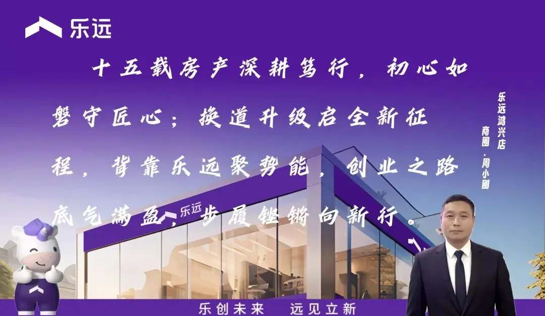 周小刚与房产行业的缘分,要从 2010 年说起。算下来,他在这一行已经坚守了整整 15 年,2010 年便开启自主创业之路,创立鸿兴房产,一干就是十五年。十五年来,他的门店始终扎根熟悉的街道,从未搬迁,只是如今也只是换了乐远的招牌,开启全新征程。
