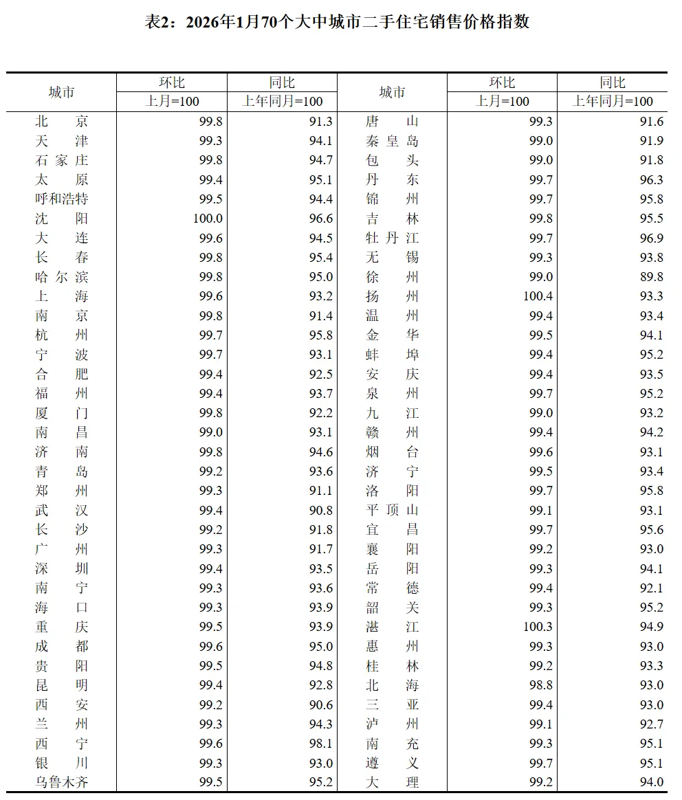 2026年1月,70大中城市二手房价指数相较去年12月显著好转,不仅体现在环比上涨城市数量上(1月扬州、湛江二手房价指数出现上涨,沈阳保持不变,彻底摆脱连续四个月无一城市上涨的尬尴),同时,还体现在下跌幅度收窄了,全国二手房加权平均指数环比仅下滑0.44个基点,相比12月份0.7个基点显著收窄。