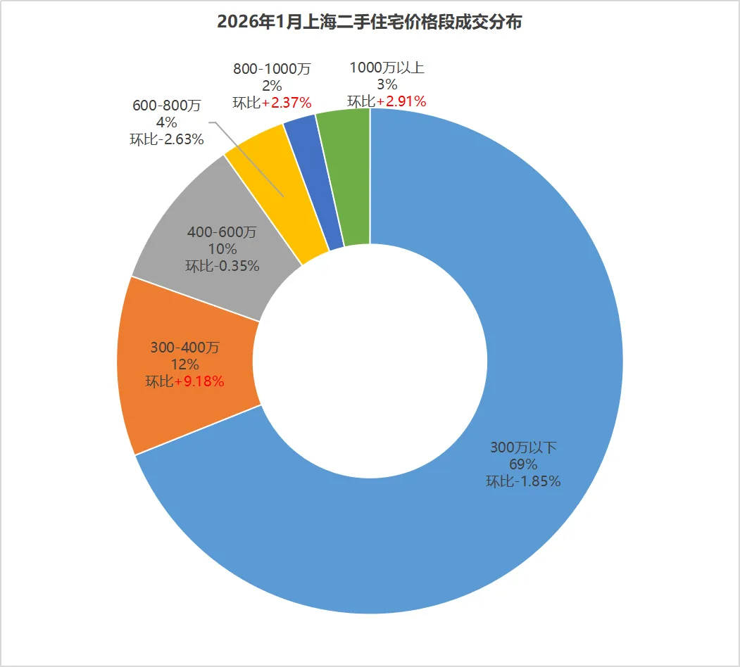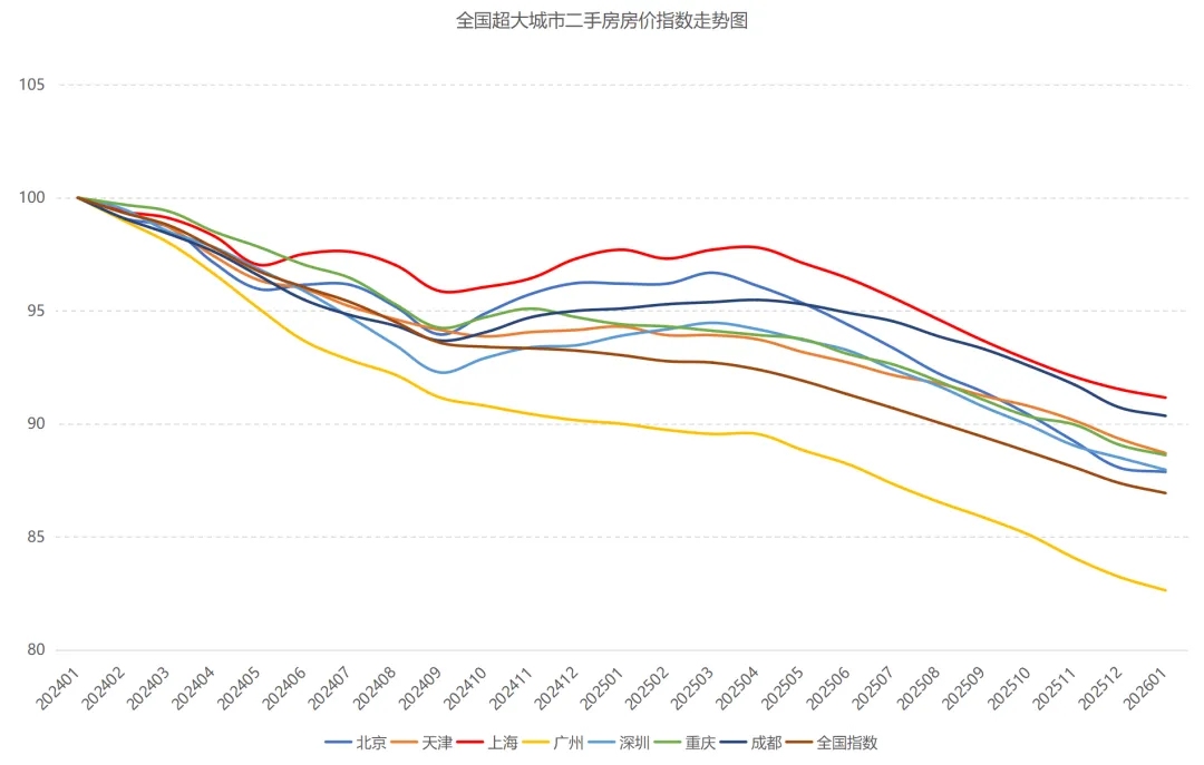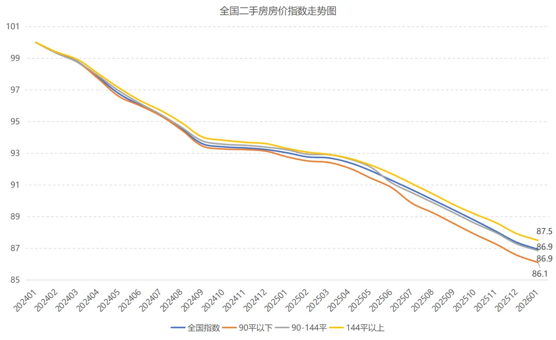 2026年1月全国二手房价指数86.9(2024年1月为100),相较2024年平均房价下跌14.1%。从面积段来看,各面积段产品环比下跌幅度也出现显著收窄,由去年下半年连续跌幅超过0.6个基点,到如今1月份的0.4个基点,下跌幅度显著平缓。