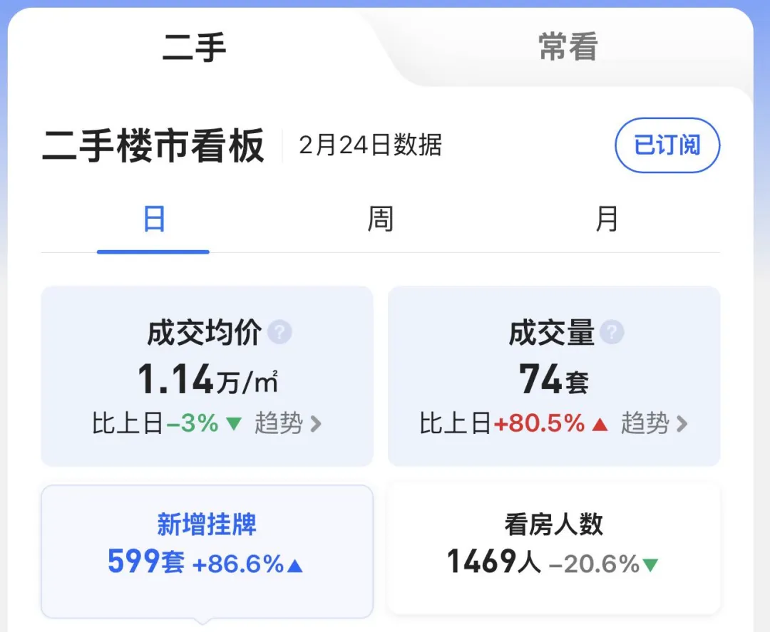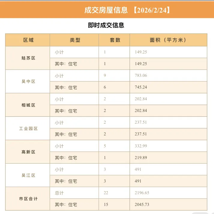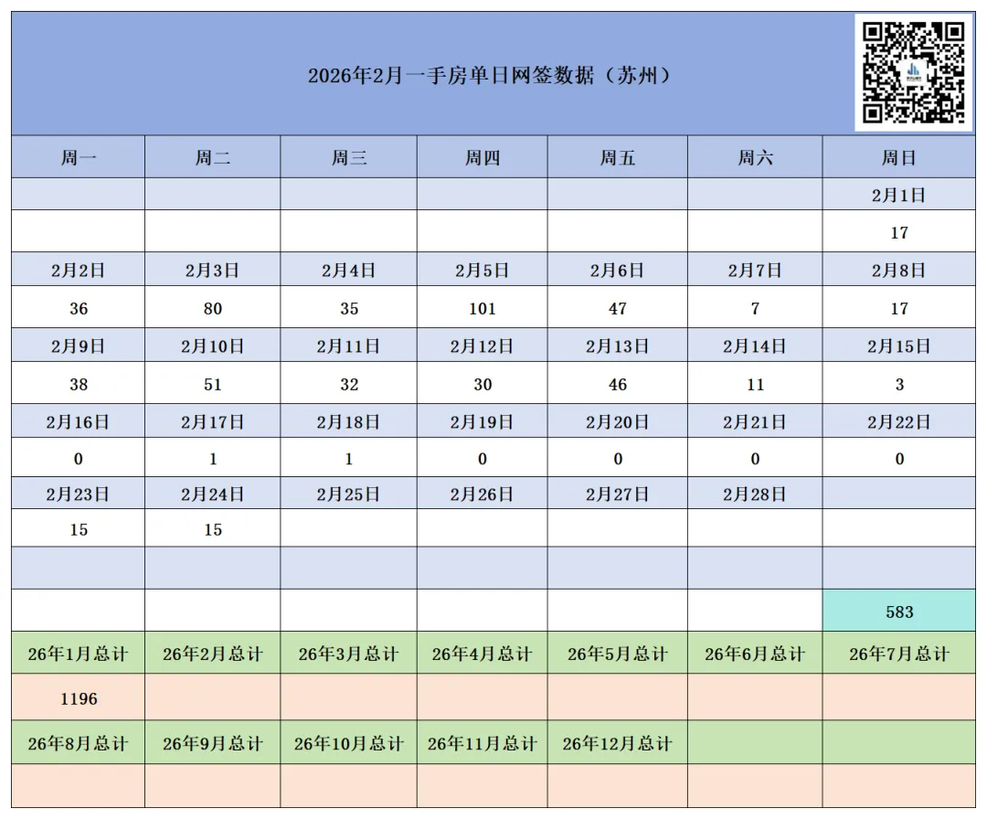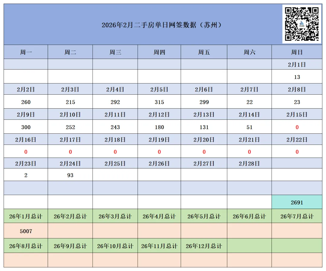 本月截至2月24日(周二),苏州六区住宅累计网签【3274套】,其中二手房累计网签【2691套】、新房累计网签【583套】。