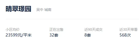 根据贝壳信息显示,晴翠璟园目前32套挂牌出售,挂牌均价23599元/平。