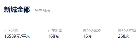 根据贝壳数据显示,2026年1月,吴中区交了529套二手住房,涉及了15个板块的256个社区及组团,套均成交面积116.19平,平均挂牌单套总价189万元,挂牌单价16266元/平,平均成交周期253天。