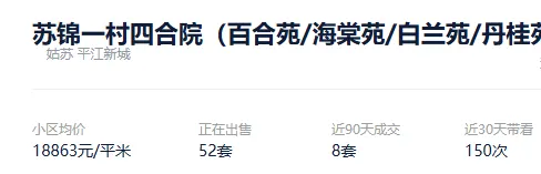 根据贝壳数据显示,2026年1月,苏州市区成交了2580套二手住房,涉及了74个板块的1195个社区及组团,套均成交面积110.43平,平均挂牌单套总价214万元,挂牌单价19371元/平,平均成交周期259天。
