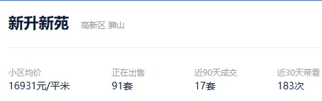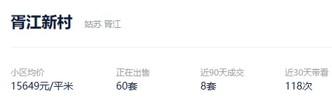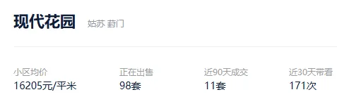 根据贝壳数据显示,今年以来,该社区成交了11套二手住房,套均成交面积95.95平,平均挂牌单套总价149万元,挂牌单价15519元/平,平均成交周期273天。