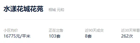 根据贝壳信息显示,水漾花城花苑目前103套挂牌出售,挂牌均价16775元/平。