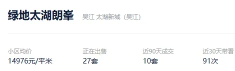 根据贝壳信息显示,绿地太湖朗峯目前27套挂牌出售,挂牌均价14976元/平。