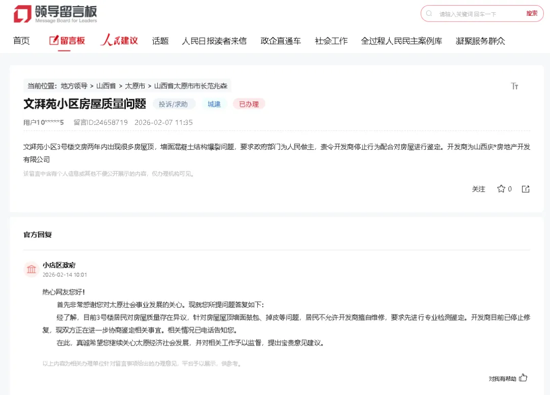 文湃苑房屋质量问题:小店区政府介入后,开发商已停止自行维修,双方正协商专业检测鉴定事宜,后续将依据鉴定结果推进整改,相关进展已电话告知业主。