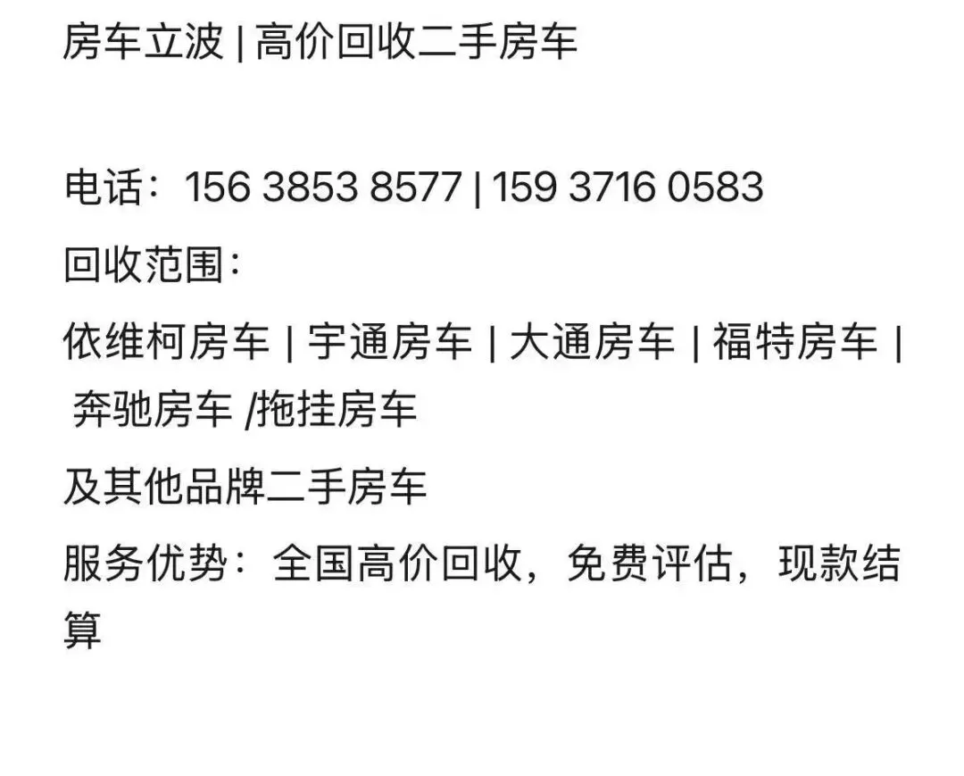 依维柯房车、宇通房车、大通房车、福特房车,以及各类轻卡房车、B型C型……只要是房车,我都收。每一款车型的市场行情,我都心中有数,给您最公允的价格。