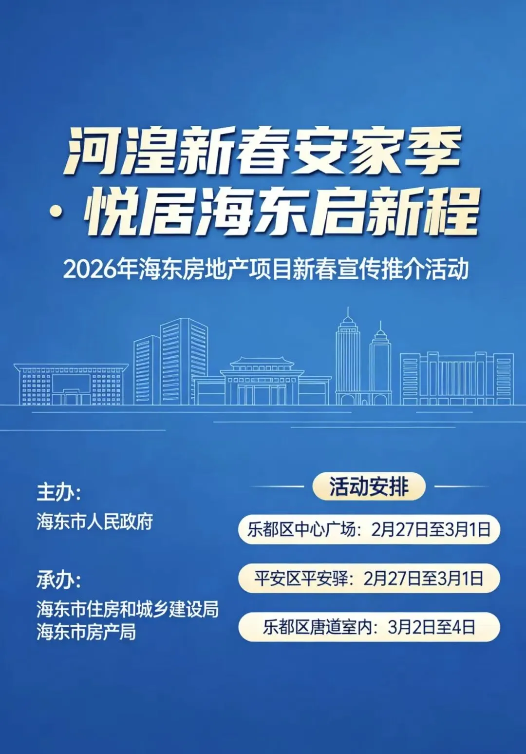 马年春意浓,置业正当时。2月27日至3月3日,海东市将以“安居河湟新春置业”为主题,在乐都区、平安区连续举办3场房地产项目集中推介活动,以惠民政策、优质房源、文化盛宴,为广大市民和返乡群众献上一场安心置业、舒心安家的一站式购房盛宴。