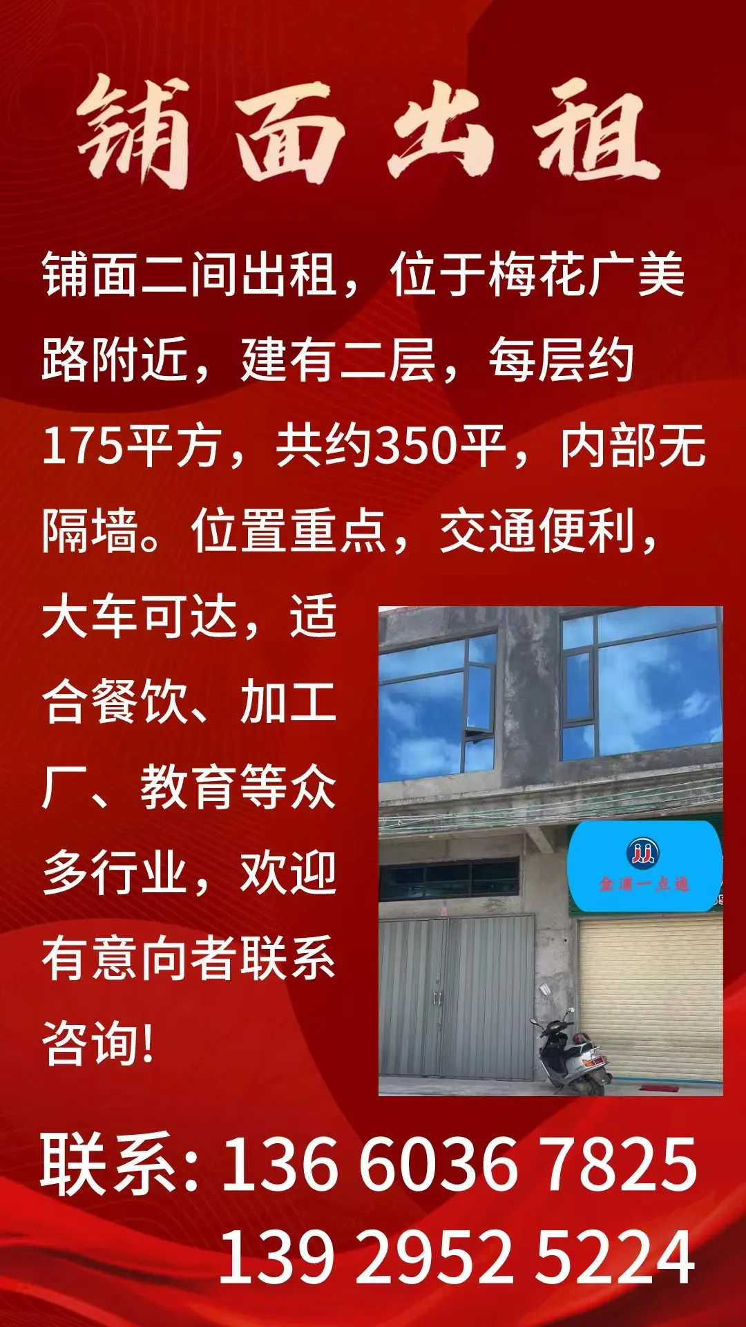 ⭕️【铺面出租】铺面二间出租,位于梅花广美路附近,建有二层,每层约175平方,共约350平,内部无隔墙。位置重点,交通便利,大车可达,适合餐饮,加工厂,教育等众多行业,欢迎 有意向者联系咨询! 联系:136 6036 7825、139 2952 5224