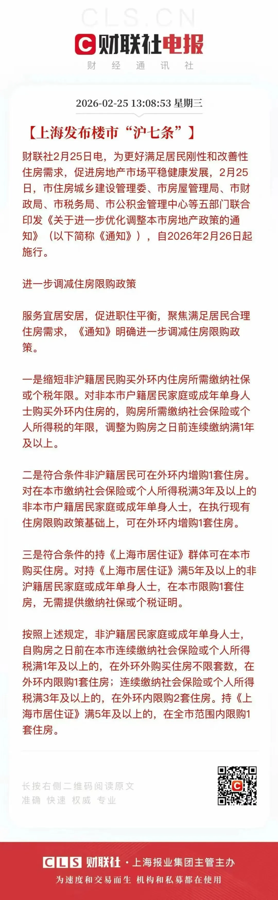 昨天,上海市住房城乡建设管理委等五部门于今天(2月25日)联合印发了《关于进一步优化调整本市房地产政策的通知》,被称为“沪七条” 。新政主要从限购、公积金贷款、房产税三个方面进行了优化,旨在支持刚性和改善性住房需求