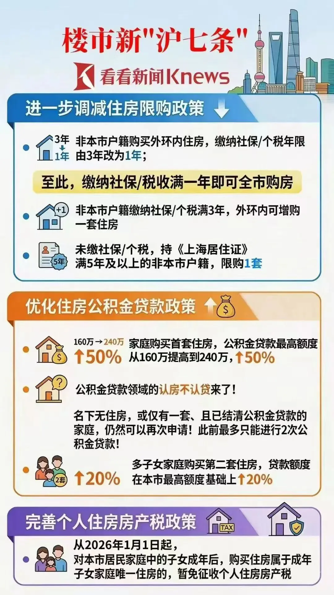 具体政策方面: 缴纳社保和税收满一年即可全市买房,即使没缴满一年,只要居住证满5年的,也可买房。买房准入门槛进一步降低。公积金贷款开始认房不认贷,没有次数限制了。而且贷款额度也大幅提高。进一步优化房产税,子女成年后另购唯一房,免征房产税等。