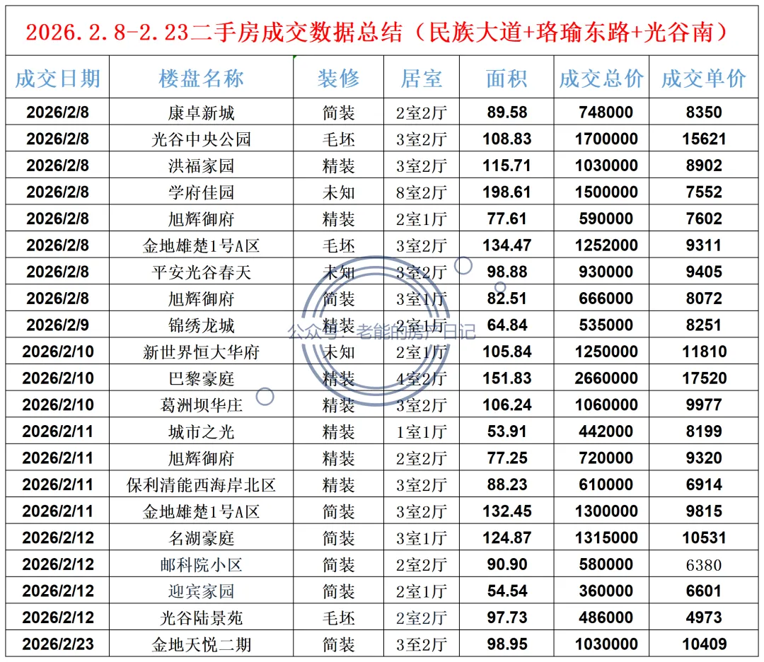 2026.2.8-2.23 二手房成交数据 (民族大道+珞瑜东路+光谷南)