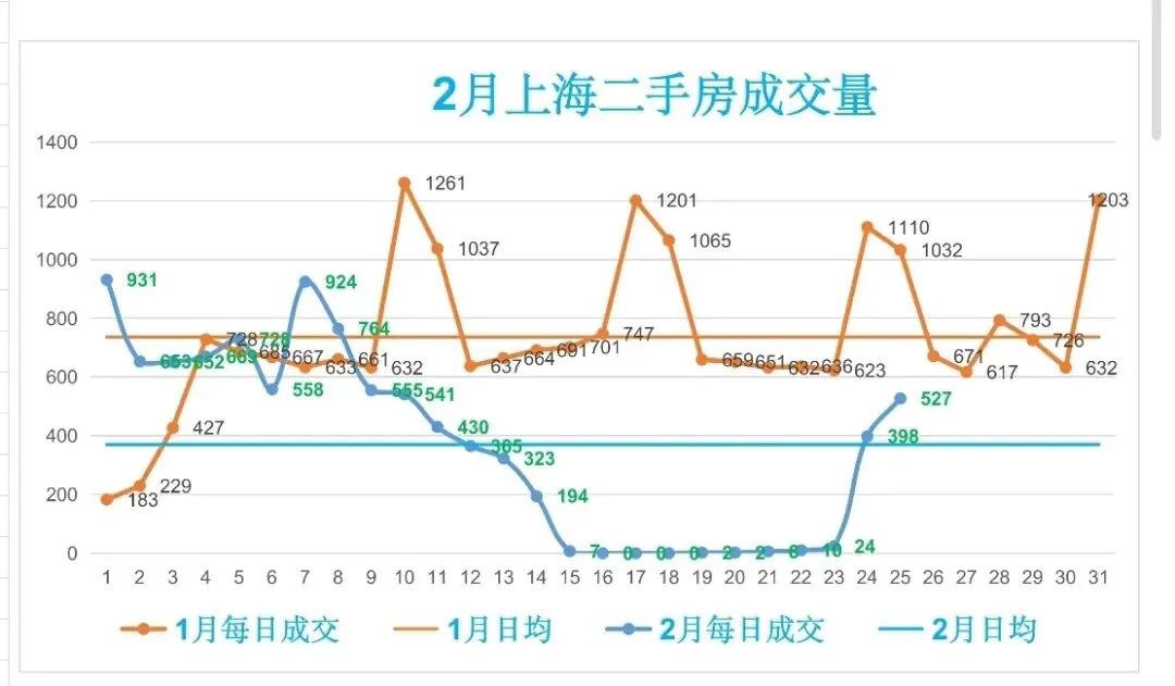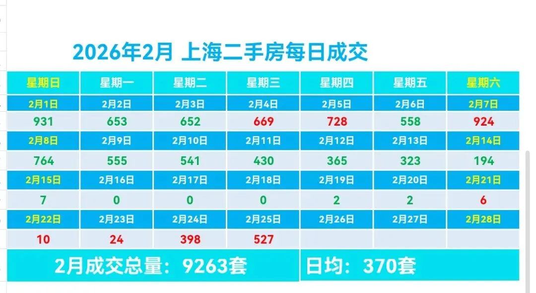 🏡2月,上海二手房成交量累计9263套,日均成交370套,较上个月日均减少366套(降幅49.73%)。