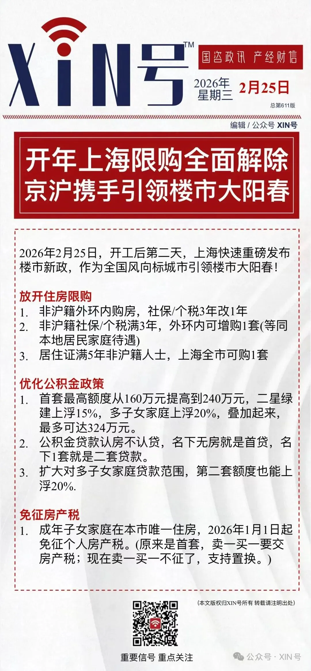 内容就这些,政府出台这一政策的根源是什么?对未来市场会带来哪些影响?作为参与者又该持有何种心态去面对?下面就和大家详细解读下。限购政策的放开,主要是面对非户籍群体。社保满一年可以买一套的根源在于两点,一是随着前几年房价的跌落,越是靠近市中心的老破小的租售比越是高,以租代购的可行性越来越大。二是收拢人才,我们反向思考一下就会明白,能够在上海社保满一年就选择安家的群体,不管处于何种思虑,都是一群工作相对稳定收入不菲的群体,这类群体也是国内各个城市急需收拢的群体。其实社保满三年的非户籍群体享受本地人待遇可以买两套的政策也是为了更进一步“安定”和收拢这类群体的补充罢了。非沪籍1年社保:外环外不限套数的政策面对的群体多是非户籍经商人士,而非稳定工作群体。居住证满5年:全市可买1套,不用社保个税这一政策面对的是上海的个体非户籍以及做些外包类型工作群体(收入)不低的群体。这类群体能够购房的核心点是高额的租售比。只有买房比租房划算,这类群体才会把积攒多年的钱拿出来充当首付。公积金额度提升以及后面房产税的减免政策,主要是针对改善型置换群体。额度能用到240万甚至324万的,按照公积金首付比例最低20%算。这类群体要买的房源最低是300万。按照这个标准尤其绿色建筑的额度放宽,政府对新房以及次新房的扶持是没有放弃的。所谓房产税减免政策只是一个辅助政策,主要是解决置换成本问题,让更多的群体参与置换。也让更多的绿色建筑能够在上海的房产市场出现。完成潜移默化的迭代。我的回答是不会!凡是看两面,虽然去年年前几个月的市场成交量很不错。但后期出现疲态以及成交房源有点“偏科”的状况。所以这次出台政策通过上面的解读,根源还是从小户型入手,也就是通过政策来稳固前段市场小户型的成交量,从而刺激后面的中端市场,以及末端市场。前面的限购政策放开还是拓展前段市场的客户群体,通过前段市场的激活从而盘活后面的市场。后面的政策多是辅助政策,针对改善型置换的优惠活动罢了。这类群体增长的根源在于租售比,如果房价上涨了,租售比下滑,会使得很多人还是选择租房而不是买房。这样政策的出台就毫无意义了,政府也不通过这些政策达到收拢人才的目的,所以房价在前端市场不会有很明显的涨幅。我的回答是会,但不是现在,这里会出现一个因心态变化出现一个滞后真空期,我预估的时间点至少会滞后到3月底到4月中旬,甚至到5月初。但这个阶段200-700万以内的成交量会较以前会有个涨幅?为什么这么说呢?就是心态,年前连续几个月的高成交量已经把几乎所有的优质房源消耗殆尽。剩下的房源、刚挂牌的房源以及未来挂牌房源房东的心态会好很多,所谓性价比高的房源短时间不会像年前一段时间那么集中了。而这些因政策影响的新进购房群体却非是“硬”刚需。所以购房者和买房子还要经过一段时间的心理博弈。200-700万的客户群体多是改善型置换群体以及硬刚需群体,在新政的刺激,尤其是刚降价处理房源改善型置换群体,很多人会出现心理恐慌的情结,所以在出手时不再有以前的犹豫,相比以前更加决绝。这就是我的断定根由,毕竟自己认知有限,如感武断,权当闲聊。我的回答是很难?因为上海的新房的问题根源不在额度问题,而在“值”的问题。也就是很多买新房客户的纠结点,看中的房源买不起,买的起的房源都出现地缘问题(位置不好)。不是看您能拿出多少钱的问题而是值不值得拿出那么多钱的问题?很多人会问额度上涨是不是让很多买不起的变成买得起的?如果您一直身处一线您就不会问了?客户群体买的起和买的不起的差额不是您们想象几十万?而是几百万!还有当下的市场环境很多人不愿背负过多的债务的。政策的出现只是利于“现行者”,而不是“观望者”(在这解释下我的新名词“现行者”,是即将准备买房或者近期有明确打算买房的群体。)。这是我对新政的解读,如果有错的或者不足的望请大家理解,这只是一家之言。关于人才收拢的部分我也不再延展,毕竟层次太高的部分话题太敏感,也很难表达清楚。