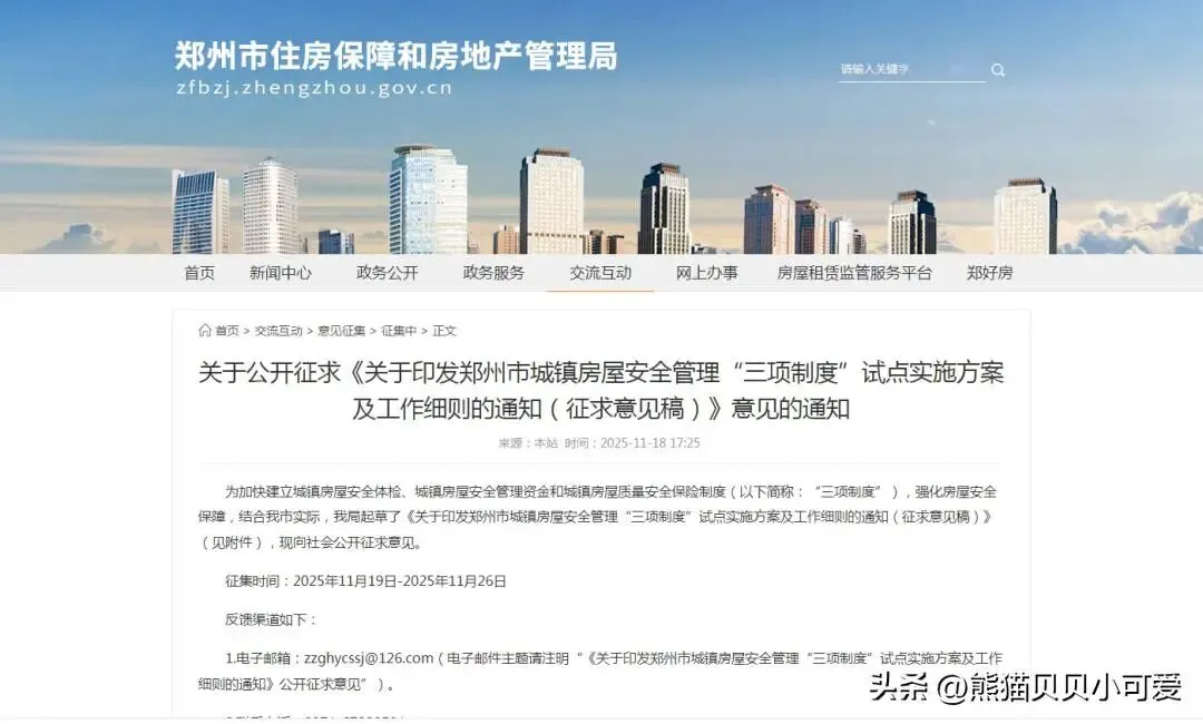 11月18日,河南省郑州市住房保障和房地产管理局发布《关于印发郑州市城镇房屋安全管理“三项制度”试点实施方案及工作细则的通知(征求意见稿)》,面向公众征求意见。