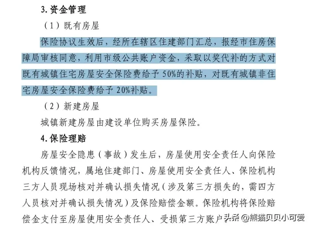 保险协议生效后,经所在辖区住建部门汇总,报经市住房保障局审核同意,利用市级公共账户资金,采取以奖代补的方式对既有城镇住宅房屋安全保险费给予50%的补贴,对既有城镇非住宅房屋安全保险费给予20%补贴。