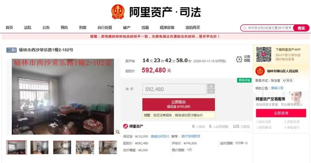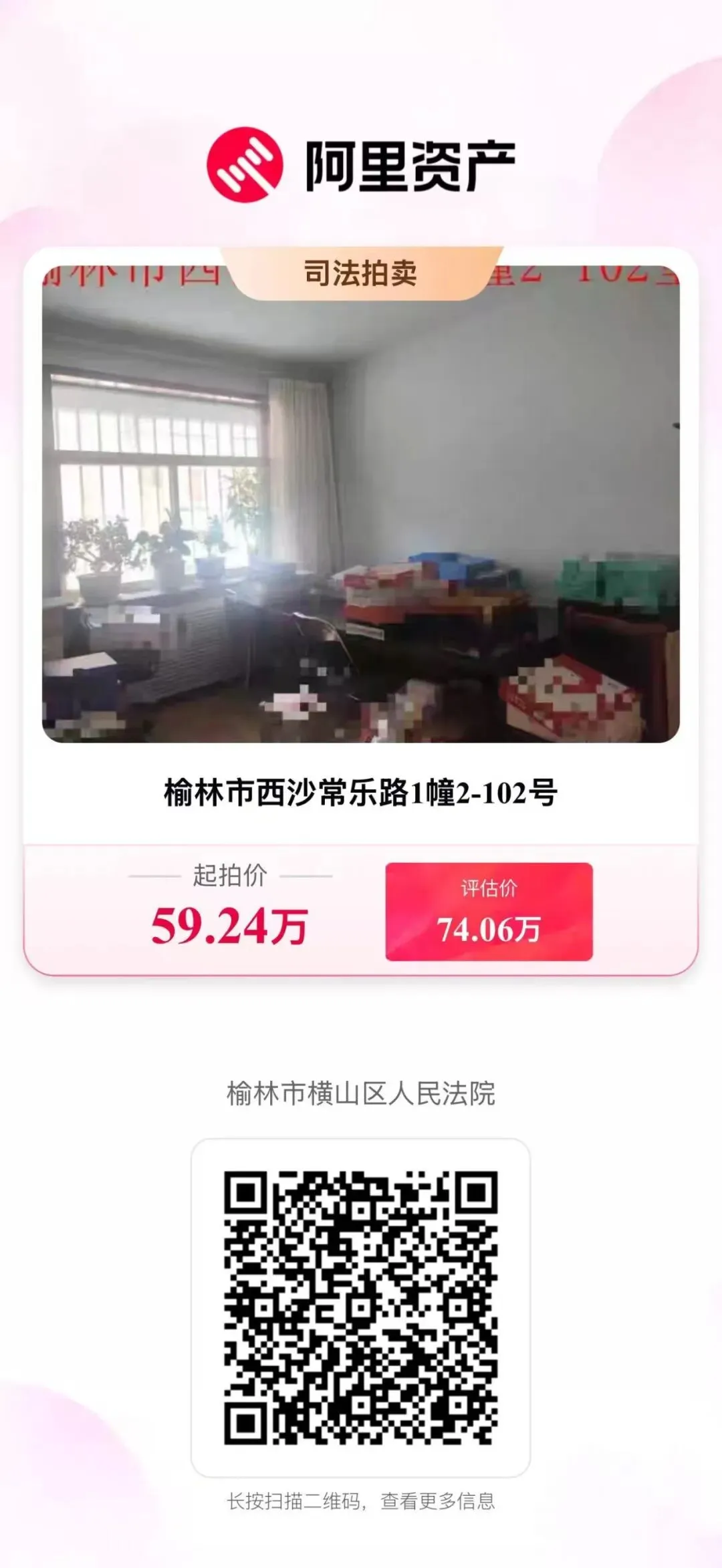 3月13日10时至14日10时,横山法院将在淘宝网司法拍卖平台上,拍卖榆阳区西沙常乐路房产,59万元起拍!