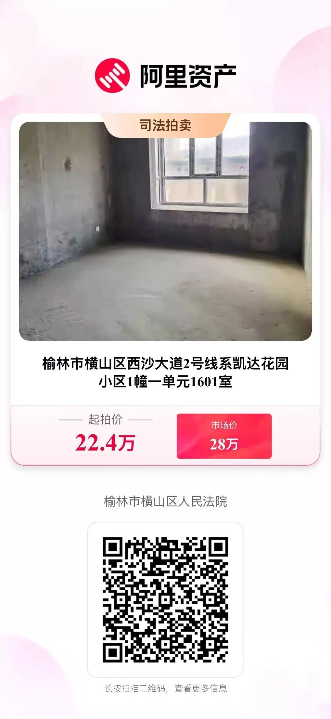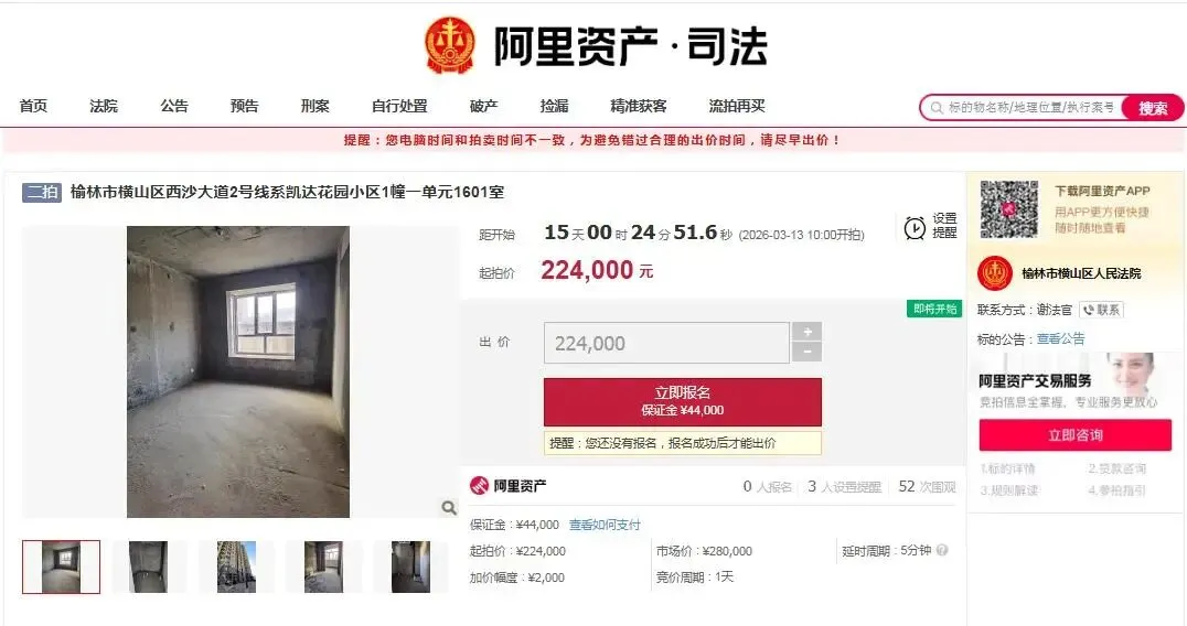 3月13日10时至14日10时,横山法院将在淘宝网司法拍卖平台上,拍卖横山区西沙凯达花园房产,22万元起拍!