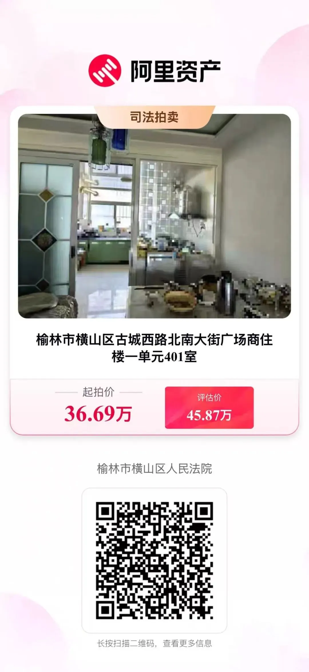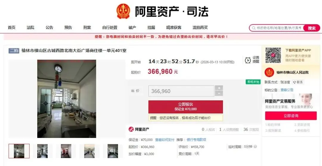 横山法院将于3月13日10时至14日10时,在淘宝网司法拍卖平台上,拍卖横山区南大街广场商住楼房产,建筑面积为106.68㎡,36万元起拍!