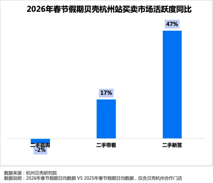 杭州贝壳研究院数据显示,2026年春节假期,杭州二手房带看量同比增长17%,新签单量更是大幅增长47%。在传统楼市“休养生息”的淡季,杭州却迎来了一波意料之外的暖流。