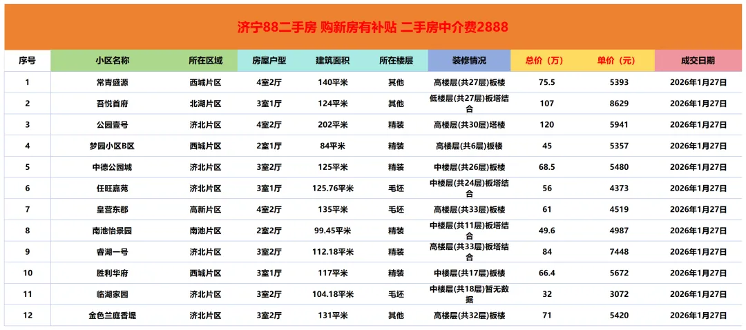 >济宁二手房成交市场价参考|1月27日