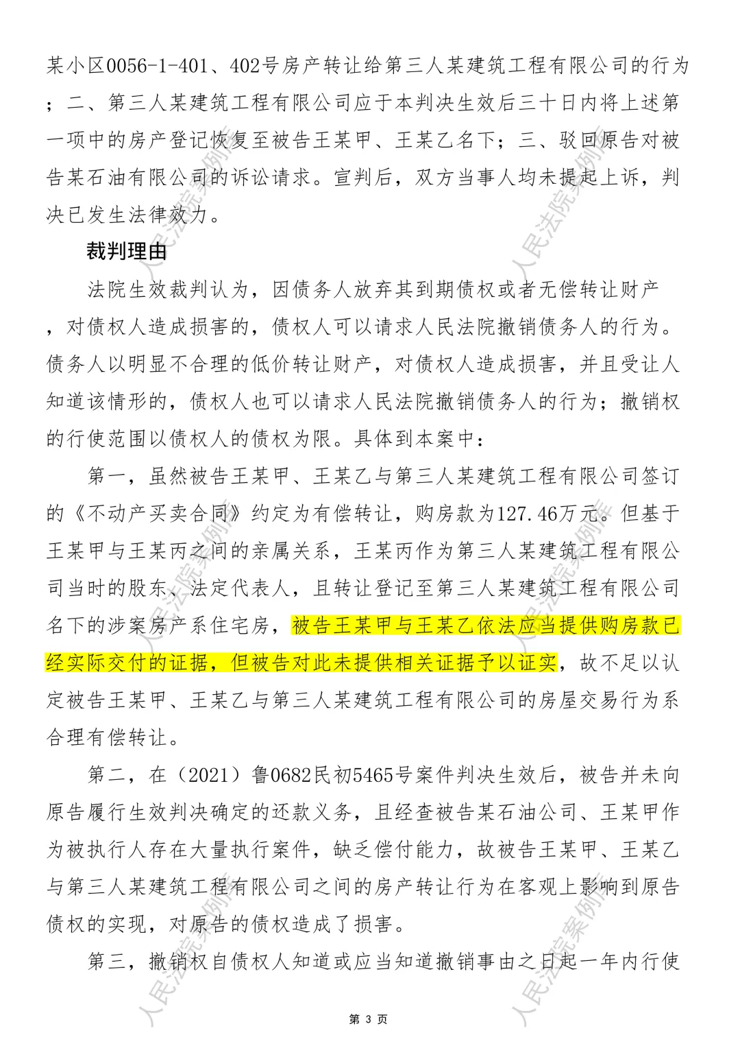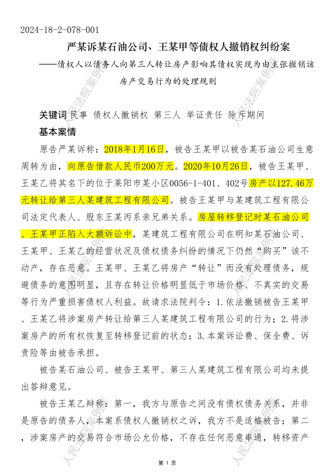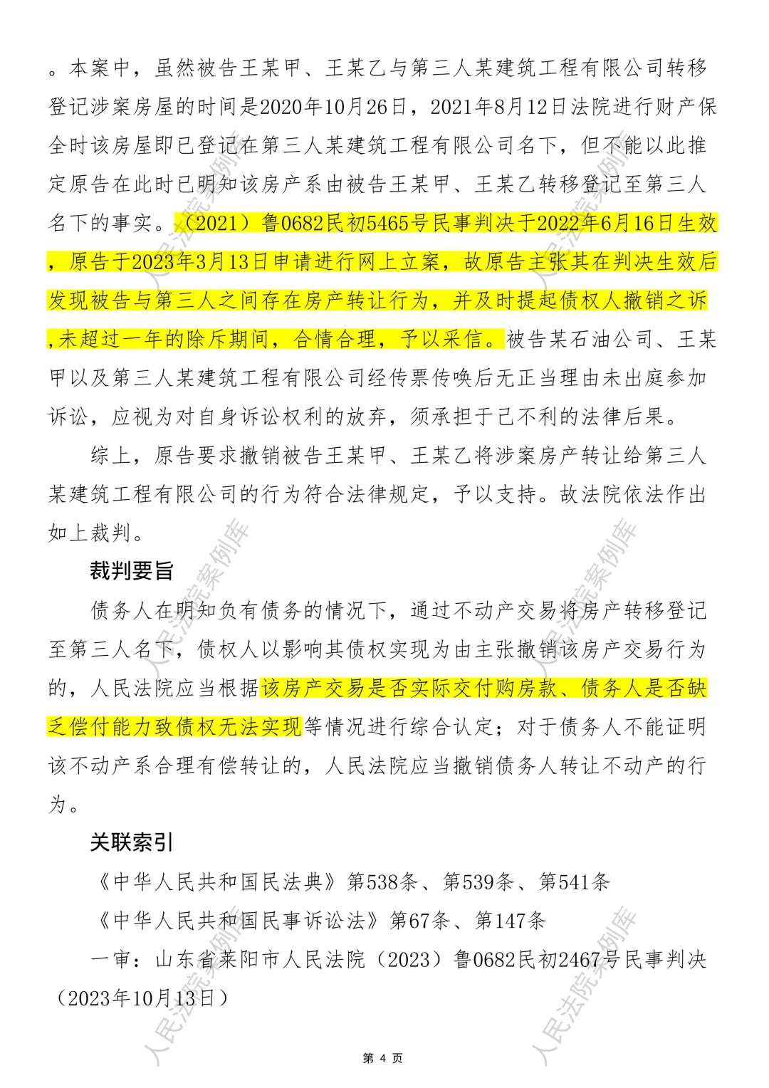 此案例系人民法院案例库的关于撤销权行使的经典案例,值得学习和参考借鉴。其核心的裁判观点就是:债务人在明知负有债务的情况下,通过不动产交易将房产转移登记至第三人名下,债权人以影响其债权实现为由主张撤销该房产交易行为的,人民法院应当根据该房产交易是否实际交付购房款、债务人是否缺乏偿付能力致债权无法实现等情况进行综合认定;对于债务人不能证明该不动产系合理有偿转让的,人民法院应当撤销债务人转让不动产的行为。Ps:具体到本案当中,该房产买卖合同载明具体交易金额,但双方都拿不出支付凭据,很难认定为有偿转让房产(暂不讨论房产交易价格高或者低的问题);且该二被告存在大量的被执行案件,这种情况下转让很难不涉嫌逃废债的主观恶意,实实在在地减少了作为债务人的自身资产,偿债能力显著减弱,对债权人的合法债权清偿造成严重不利影响,彭律认为此种情况下撤销该房屋转让行为,让该房屋回归债务人名下,继而推动该房屋的拍卖或者变现,以期其债权人的合法债权能够得到进一步的清偿。现在债务人在面临巨额债务的情况下,转让房产或者名下资产的情况屡见不鲜;相应的,债权人在面对这种情况下,及时关注债务人生活、工作、资产情况以便于及时协同律师采取行动狙击债务人逃废债行为,最终债权变现才有可能(债务人们都在不断进化逃废债的方式,债权变现现在需要越来越多的手段,相应的诉讼,时间、金钱、精力成本都在增加up)。关键词: 民事 债权人撤销权 第三人 举证责任 除斥期间 逃废债 无偿转让 无偿赠与第五百三十八条 债务人以放弃其债权、放弃债权担保、无偿转让财产等方式无偿处分财产权益,或者恶意延长其到期债权的履行期限,影响债权人的债权实现的,债权人可以请求人民法院撤销债务人的行为。第五百三十九条 债务人以明显不合理的低价转让财产、以明显不合理的高价受让他人财产或者为他人的债务提供担保,影响债权人的债权实现,债务人的相对人知道或者应当知道该情形的,债权人可以请求人民法院撤销债务人的行为。第五百四十条 撤销权的行使范围以债权人的债权为限。债权人行使撤销权的必要费用,由债务人负担。第五百四十一条 撤销权自债权人知道或者应当知道撤销事由之日起一年内行使。自债务人的行为发生之日起五年内没有行使撤销权的,该撤销权消灭。第五百四十二条 债务人影响债权人的债权实现的行为被撤销的,自始没有法律约束力。3.2《最高人民法院关于适用《中华人民共和国民法典》合同编通则若干问题的解释》(最高法通过司法解释的形式细化裁判规则,为狙击逃废债行为提供法律支撑)第四十二条 对于民法典第五百三十九条规定的“明显不合理”的低价或者高价,人民法院应当按照交易当地一般经营者的判断,并参考交易时交易地的市场交易价或者物价部门指导价予以认定。转让价格未达到交易时交易地的市场交易价或者指导价百分之七十的,一般可以认定为“明显不合理的低价”;受让价格高于交易时交易地的市场交易价或者指导价百分之三十的,一般可以认定为“明显不合理的高价”。债务人与相对人存在亲属关系、关联关系的,不受前款规定的百分之七十、百分之三十的限制。第四十三条 债务人以明显不合理的价格,实施互易财产、以物抵债、出租或者承租财产、知识产权许可使用等行为,影响债权人的债权实现,债务人的相对人知道或者应当知道该情形,债权人请求撤销债务人的行为的,人民法院应当依据民法典第五百三十九条的规定予以支持。第四十四条 债权人依据民法典第五百三十八条、第五百三十九条的规定提起撤销权诉讼的,应当以债务人和债务人的相对人为共同被告,由债务人或者相对人的住所地人民法院管辖,但是依法应当适用专属管辖规定的除外。两个以上债权人就债务人的同一行为提起撤销权诉讼的,人民法院可以合并审理。第四十五条 在债权人撤销权诉讼中,被撤销行为的标的可分,当事人主张在受影响的债权范围内撤销债务人的行为的,人民法院应予支持;被撤销行为的标的不可分,债权人主张将债务人的行为全部撤销的,人民法院应予支持。债权人行使撤销权所支付的合理的律师代理费、差旅费等费用,可以认定为民法典第五百四十条规定的“必要费用”。第四十六条 债权人在撤销权诉讼中同时请求债务人的相对人向债务人承担返还财产、折价补偿、履行到期债务等法律后果的,人民法院依法予以支持。债权人请求受理撤销权诉讼的人民法院一并审理其与债务人之间的债权债务关系,属于该人民法院管辖的,可以合并审理。不属于该人民法院管辖的,应当告知其向有管辖权的人民法院另行起诉。债权人依据其与债务人的诉讼、撤销权诉讼产生的生效法律文书申请强制执行的,人民法院可以就债务人对相对人享有的权利采取强制执行措施以实现债权人的债权。债权人在撤销权诉讼中,申请对相对人的财产采取保全措施的,人民法院依法予以准许。彭小磊律师在位于重庆市九龙坡区杨家坪步行街的重庆展旭律师事务所执业,现为专职律师。彭小磊律师是90后青年律师,毕业于江南大学,并取得法学学士学位,取得《中华人民共和国法律职业资格证书(A证)》,现为重庆市律师协会会员。彭小磊律师立足重庆本土区域,发