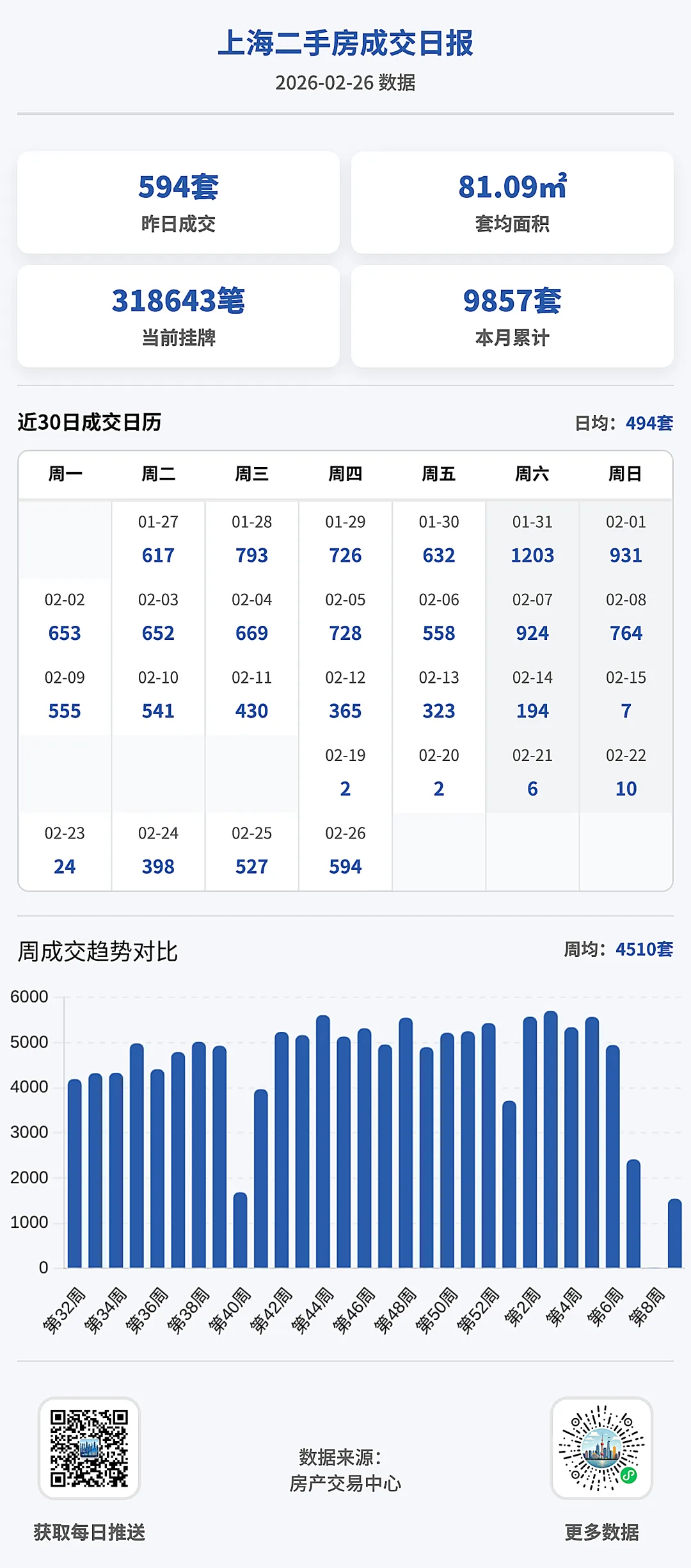 2月26日 周四,上海新房和上海二手房成交量合计774套